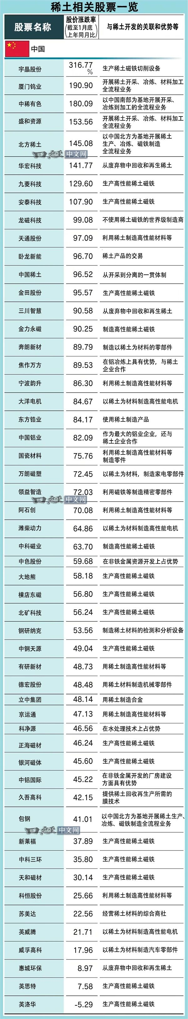 在股价涨幅方面,截至1月底,宇晶股份(002943.SZ)股价较上年同月上涨316.77%,厦门钨业(600549.SH)同比上涨190.9%、中稀有色(600259.SH)同比上涨180.09%。此外。盛和资源(600392.SH)、北方稀土(600111.SH)、华宏科技(002645.SZ)均较上年同月上涨超140%。