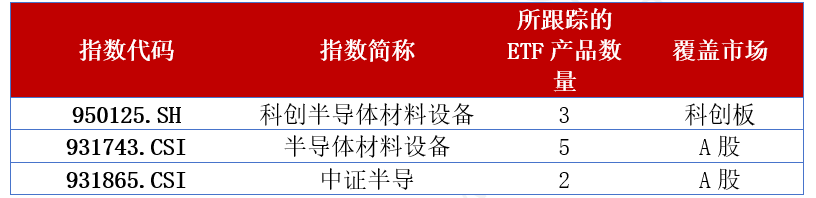 目前市场上半导体设备主题的指数有三只,分别是科创半导体材料设备指数、半导体材料设备指数、中证半导产业指数。顾名思义,其中科创半导体材料设备指数成分股均来自科创板,其余两只为A股全市场选股。