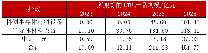 从2023年至2026年的数据来看,半导体设备相关ETF产品规模呈现爆发式增长,总规模从10.69亿元激增至451.79亿元,三年间增长超40倍,反映出市场对半导体赛道的高度关注和资金持续涌入。