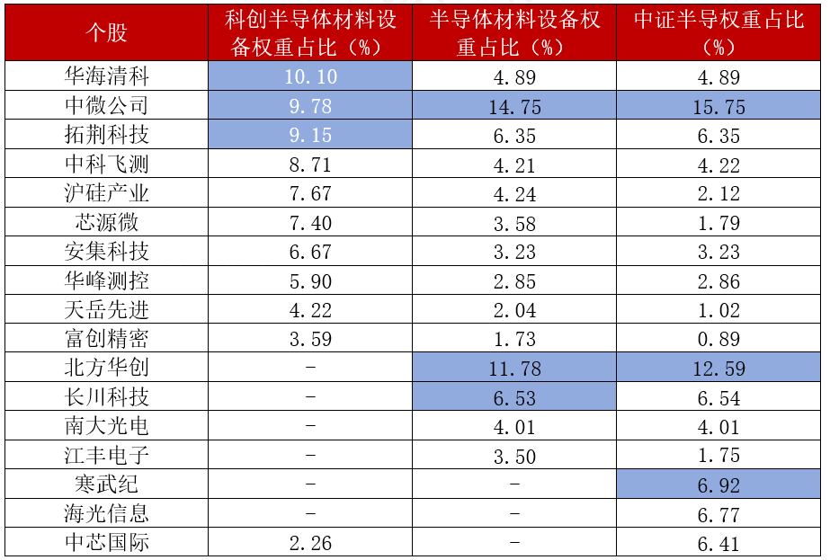 科创半导体材料设备指数极致押注科创板“硬科技”,给了华海清科(688120.SH)(10.10%)、中微公司(9.78%)、拓荆科技(688072.SH)(9.15%)极高的权重,不含北方华创、长川科技(300604.SZ)等非科创板个股,适合看好科创板设备材料国产替代的投资者。