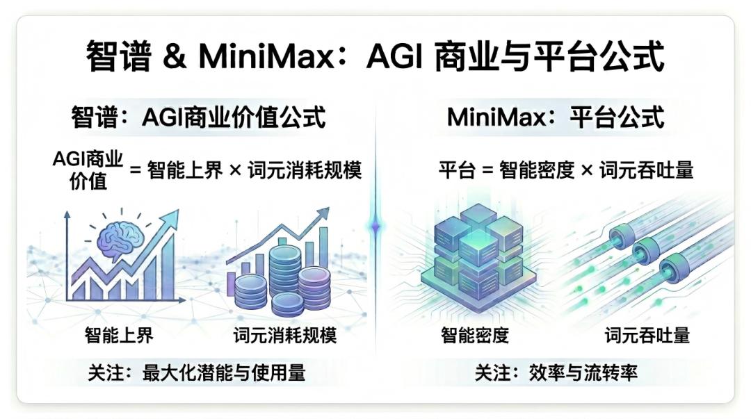 两个公式看似相近,实则指向截然不同的路径:智谱追求模型能力的绝对天花板,押注B端高价值场景的定价权;MiniMax强调单位Token内的有效智能价值,用效率和规模占领C端入口。具体而言: