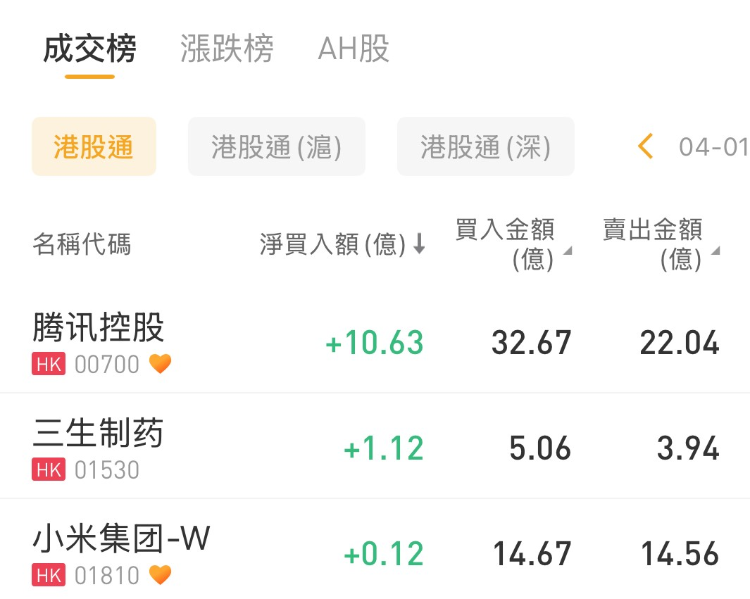 腾讯控股、三生制药、小米集团-W分别获净买入10.63亿港元、1.12亿港元、1150万港元;