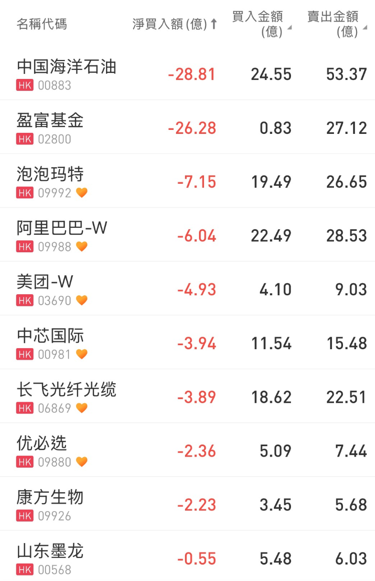 中国海洋石油、盈富基金、泡泡玛特分别遭净卖出28.81亿港元、26.28亿港元、7.15亿港元。