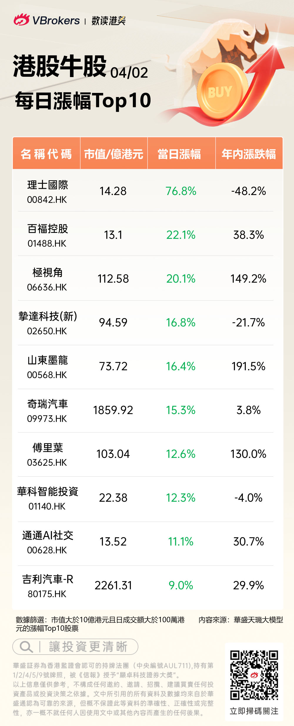 發仔统计了每日港股涨幅Top10,具体名单如下: