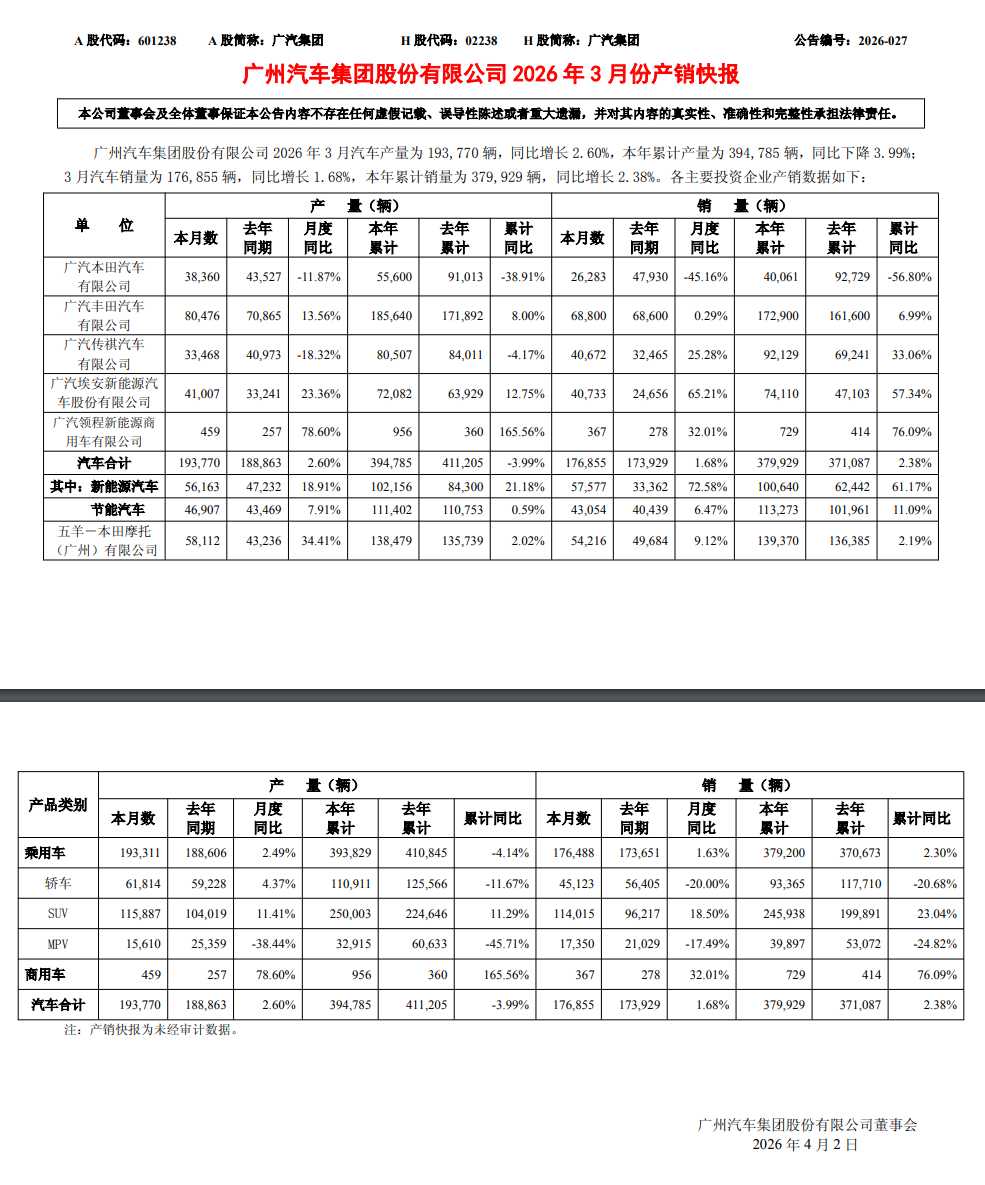 4月2日,广汽集团(601238.SH)发布了2026年3月份产销快报。