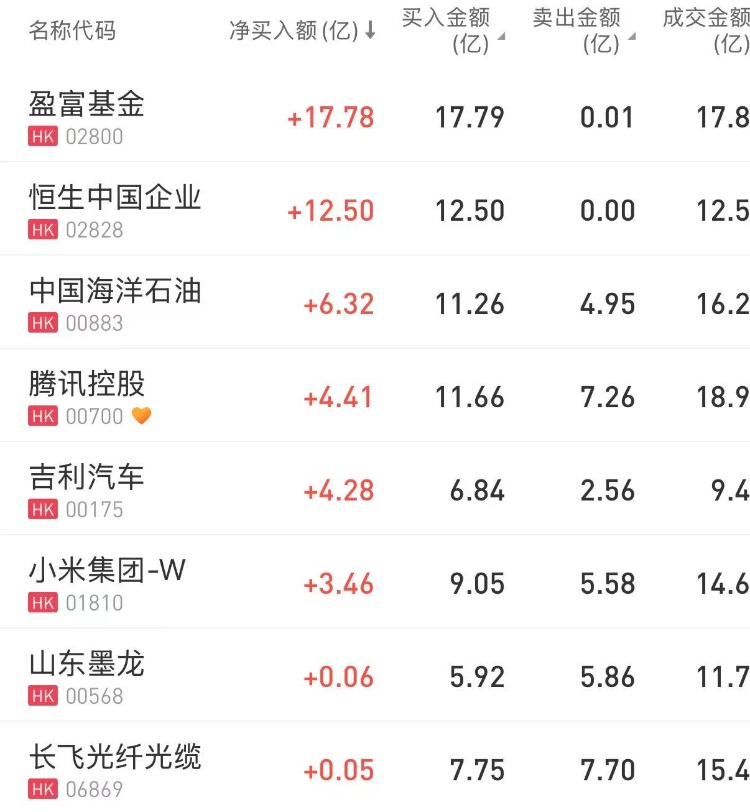 盈富基金、恒生中国企业、中国海洋石油分别获净买入17.78亿港元、12.50亿港元、6.32亿港元;