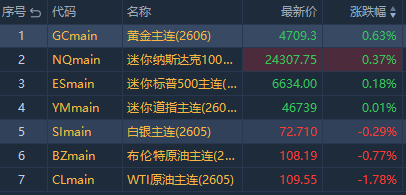 相关标的: $NQmain 、 $ESmain 、 $YMmain 、 $CLmain 、 $BZmain 、 $GCmain 、 $SImain
