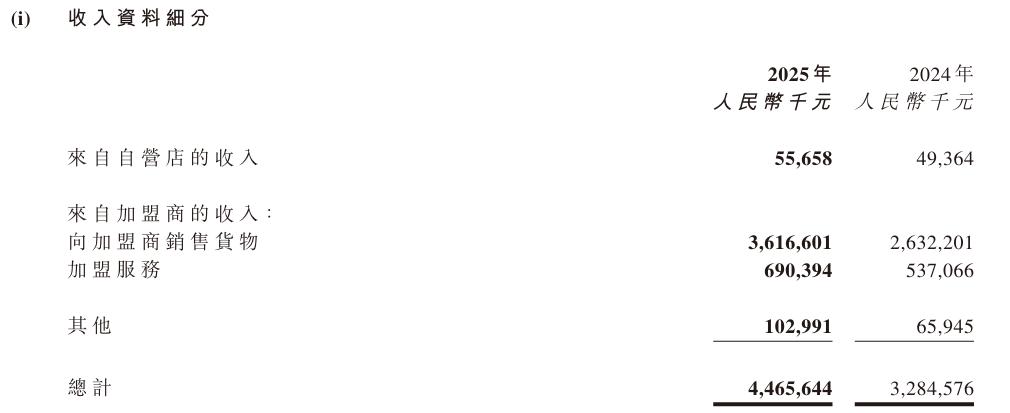 其他五家则依靠加盟,它们卖的不是奶茶,而是向加盟商出售原料、设备、包装材料和品牌服务。加盟商越多、门店开得越多,收入越高。开店本身就是赚钱的方式。