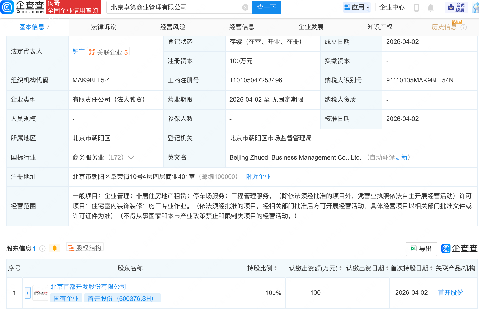 企查查APP显示,近日,北京卓第商业管理有限公司、北京朗启商业管理有限公司成立,经营范围均包含:企业管理;非居住房地产租赁;停车场服务;工程管理服务等。企查查股权穿透显示,二者皆由首开股份(600376.SH)全资持股。