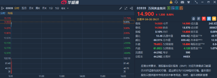 华盛资讯4月8日讯,港股贵金属板块全线飙升,万国黄金集团涨近10%,赤峰黄金、灵宝黄金涨逾7%,紫金黄金国际、山东黄金涨超6%。