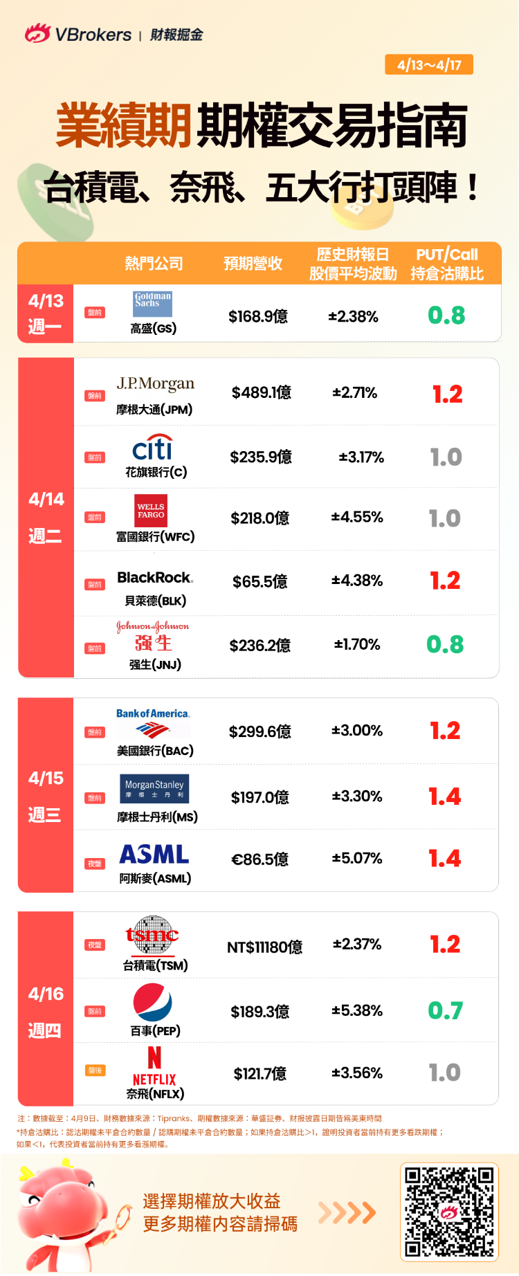 据隔夜期权成交的数据显示,下周最受关注的高盛、摩根大通、台积电,其未平仓PUT单和Call的比例分别为0.8、1.2、1.2。