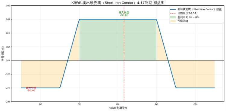 整体分析而言,对行业财报期权策略案例首选银行业 $KBWB ETF:卖出铁秃鹰 / 铁蝶式(Short Iron Condor / Iron Butterfly);当前价格为84.32美元,最适合当前:高IV + 方向不明 + 偏谨慎但不极端看空的市场情况。