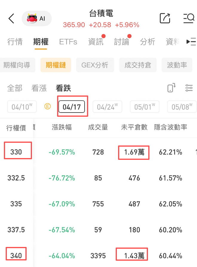 从华盛通期权链统计最新期权成交情况发现,下周五到期,行权价分别为330美元、340美元的PUT单获大量囤积,未平仓量均分别为1.69万张、1.43万张。(TSM_260417_P_330.0 、TSM_260417_C_330.0 ),体现出大资金对财报日股价下跌的对冲需求高。