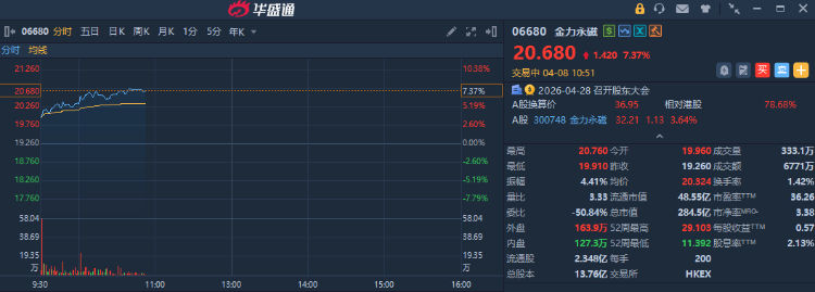 华盛资讯4月8日获悉,金力永磁涨超7%,截至发稿,涨7.37%,报20.68港元,成交额近7000万港元。