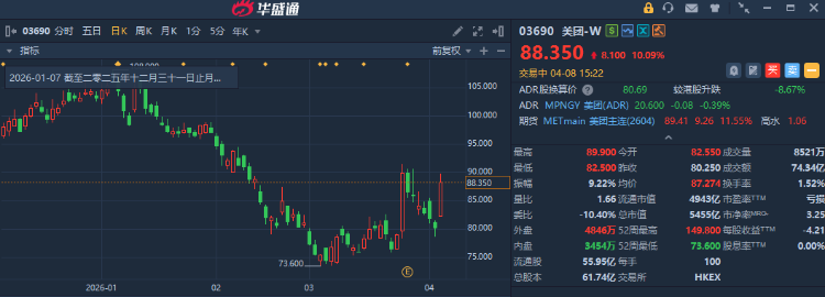 美团( $03690.HK )连跌六日后反弹,暂时最多升逾10%,重上10天及50天线。