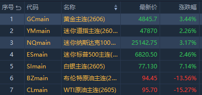相关标的: $NQmain 、 $ESmain 、 $YMmain 、 $CLmain 、 $BZmain 、 $GCmain 、 $SImain