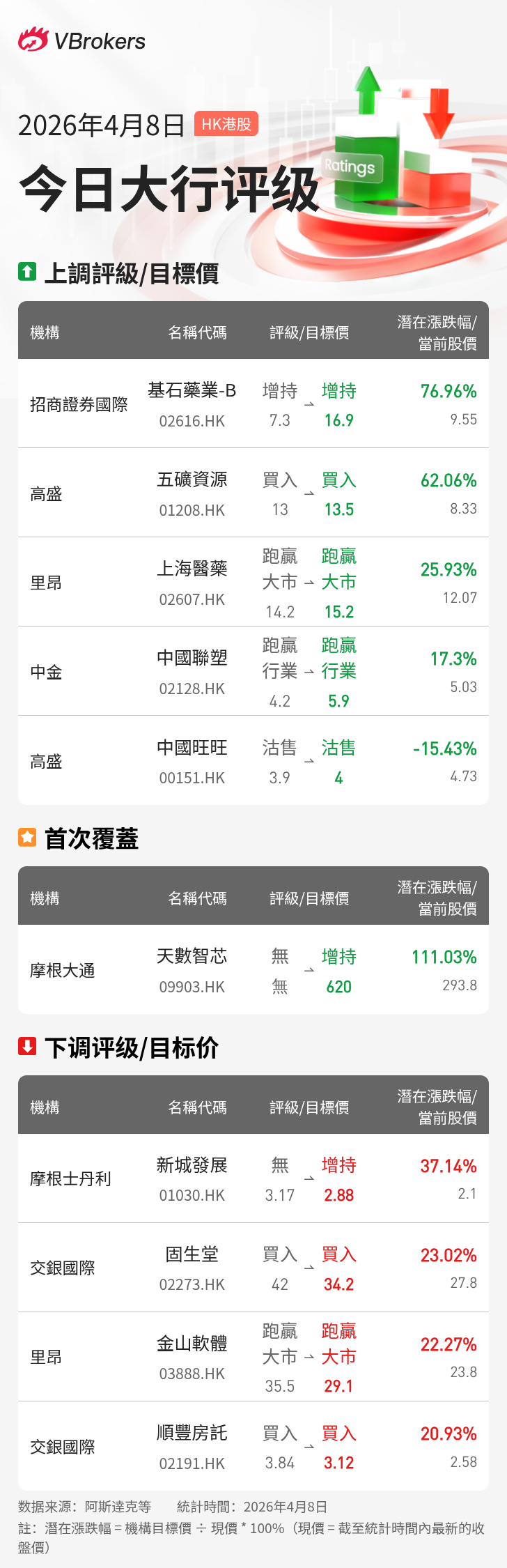 | 里昂 | 上海医药 | 02607.HK | 上调 | $15.2 | $12.07 | 25.93% |