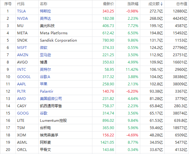 第3名美光科技收高7.72%,成交199.1亿美元。周三美股存储概念股集体大涨。消息面上,戴尔科技CEO迈克尔·戴尔警告,随着单机内存容量与数据中心部署规模同步扩张,全球AI内存需求将较现有水平激增625倍,而供给端的追赶需要数年时间。他表示,AI基础设施中每个内存容量和系统整体规模正同步扩大,两者叠加将形成内存总需求约625倍增长的结构性格局。