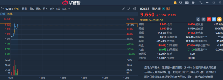 华盛资讯4月9日讯,图达通盘中直线拉升涨逾13%,报9.65港元,当前成交额逾4000万港元。