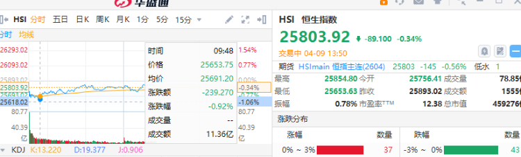 美伊停火或存有变数,港股上日急升后早段回吐,恒指低开136点后,最多跌239点,低位回落至25,600点水平。