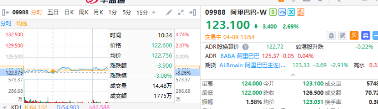 阿里上日股价急升逾6%,曾上试20天线(约127元),今日早段回吐,暂时最多跌约3%。