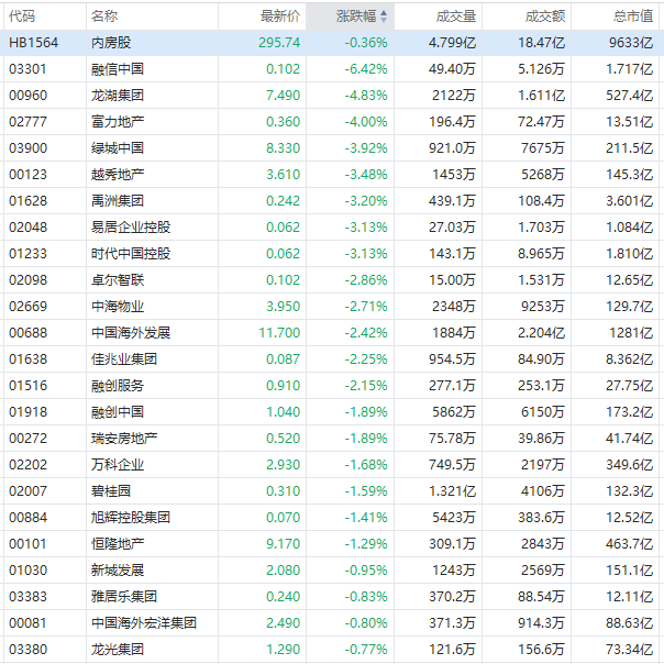 内房股再度走低,截至发稿,龙湖集团、绿城中国大跌近4%,中国海外发展、融创中国跌约2%,万科企业、碧桂园跌超1.5%。