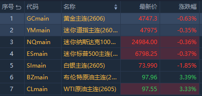 相关标的: $NQmain 、 $ESmain 、 $YMmain 、 $CLmain 、 $BZmain 、 $GCmain 、 $SImain