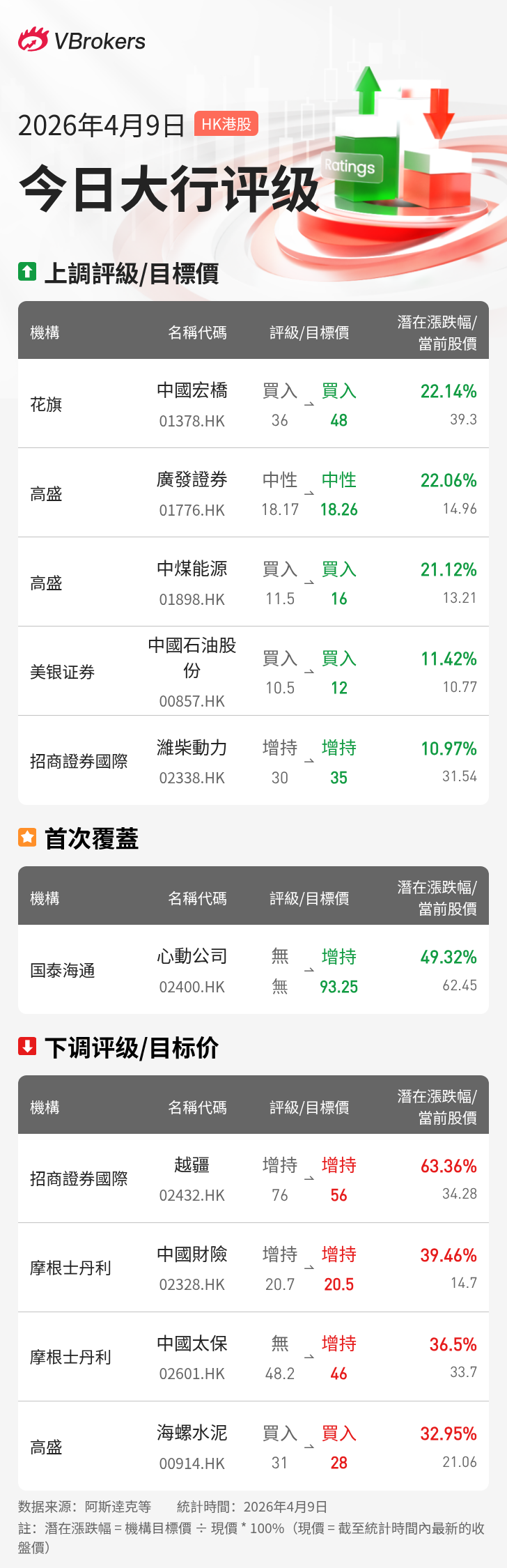 | 高盛 | 中煤能源 | 01898.HK | 上调 | $16.0 | $13.21 | 21.12% |