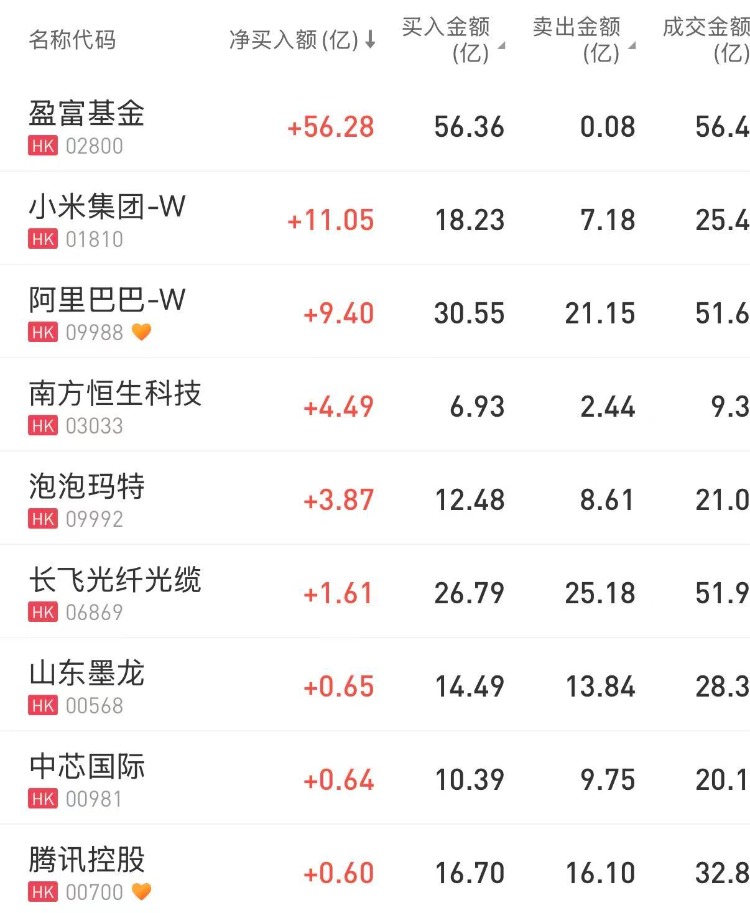 盈富基金、小米集团-W、阿里巴巴-W分别获净买入56.28亿港元、11.05亿港元、9.40亿港元。