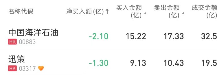 中国海洋石油、迅策分别遭净卖出2.10亿港元、1.30亿港元。