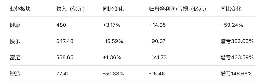 快乐板块收入647.48亿元,同比下降15.59%,是拖累营收的最大因素。归母净亏损90.67亿元,同比增亏382.63%。