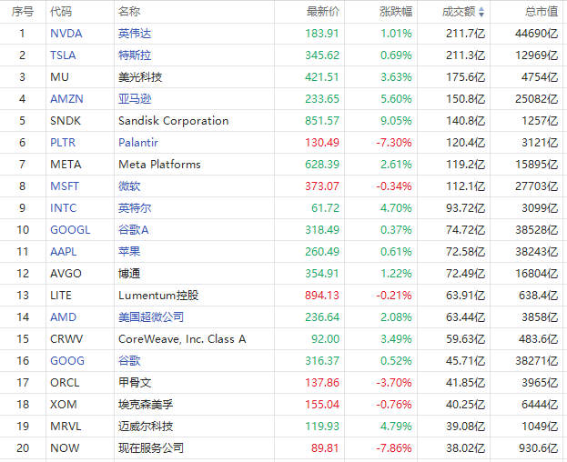 第3名美光收高3.64%,成交175.6亿美元。瑞银将美光科技目标股价从510美元上调至535美元。