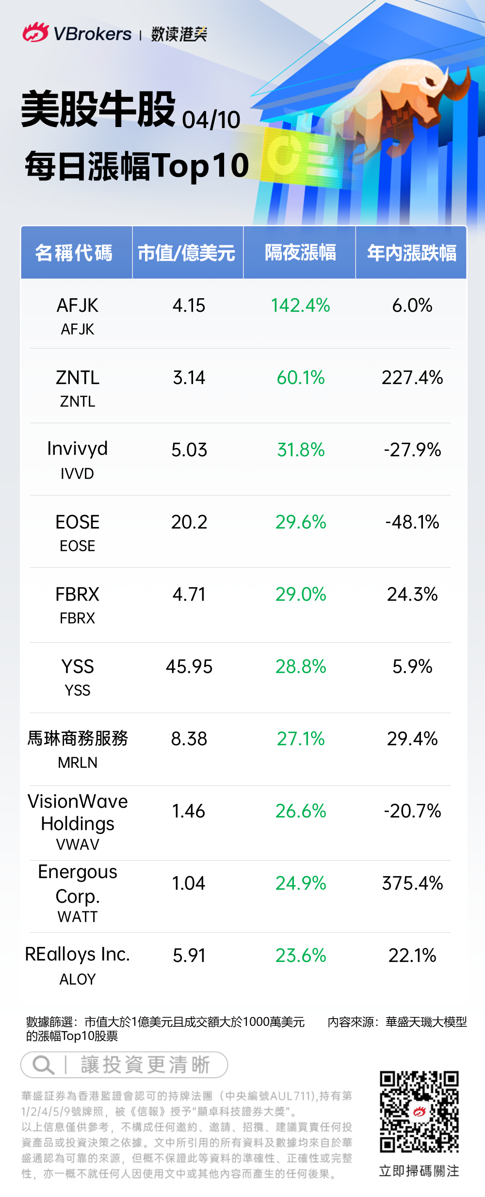 编者按:《美股牛股》栏目旨在追踪每日美股市场涨幅TOP10牛股,紧抓涨势迅猛的个股,助力投资者快速把握美股交易机会。