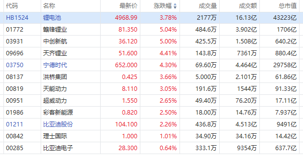 锂业股继续走高,赣锋锂业、中创新航均涨超5%,天齐锂业、宁德时代涨超4%。