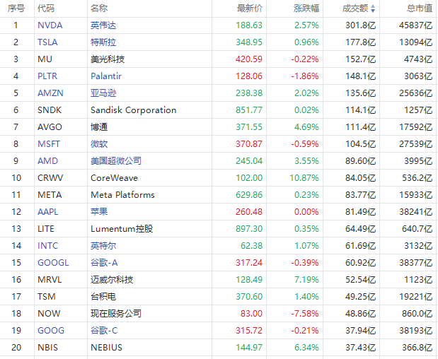 第16名迈威尔科技收高7.19%,周内累涨超20%,成交52.54亿美元。日前,英伟达宣布以20亿美元投资入股迈威尔科技并与其展开合作,此举延续了英伟达近一年来一连串对AI产业链的投资布局,显示其正积极强化AI生态版图。