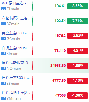 亚太时间周一(4月13日),原油期货跳空高开,截至发稿,美、布油期货 $CLmain 、 $BZmain 均涨约8%;COMEX期货黄金跌超2%,COMEX期货白银跌超4%;美股三大期指跌超1%。