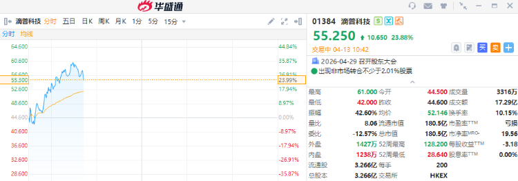 滴普科技逆市一度涨超35%,截至发稿,涨近24,报55.25港元,成交额17.29亿港元。