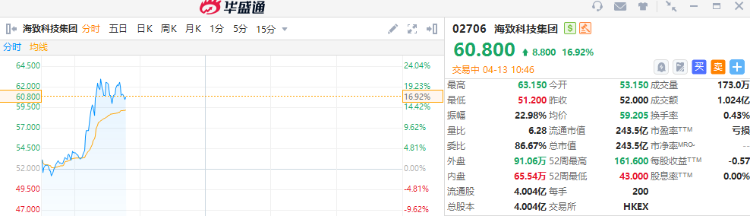 海致科技集团一度涨超20%,截至发稿涨近17%,报60.8港元,成交额1.024亿港元。