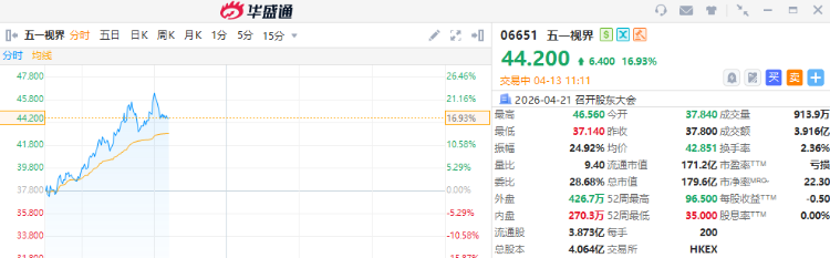 五一视界早盘一度涨超23%,截至发稿,涨近17%,报44.2港元,成交额3.916亿港元。