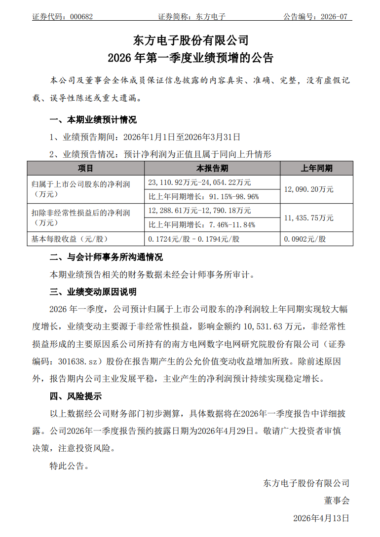 4月13日,东方电子(000682.SZ)披露2026年第一季度业绩预告,预计归属于上市公司股东的净利润为2.31亿元-2.41亿元,比上年同期增长91.15%-98.96%;扣除非经常性损益后的净利润为1.23亿元-1.28亿元,比上年同期增长7.46%-11.84%。上一年同期公司实现归属于上市公司股东的净利润为1.21亿元,归属于上市公司股东的扣除非经常性损益后的净利润为1.14亿元,基本每股收益为0.0902元/股。
