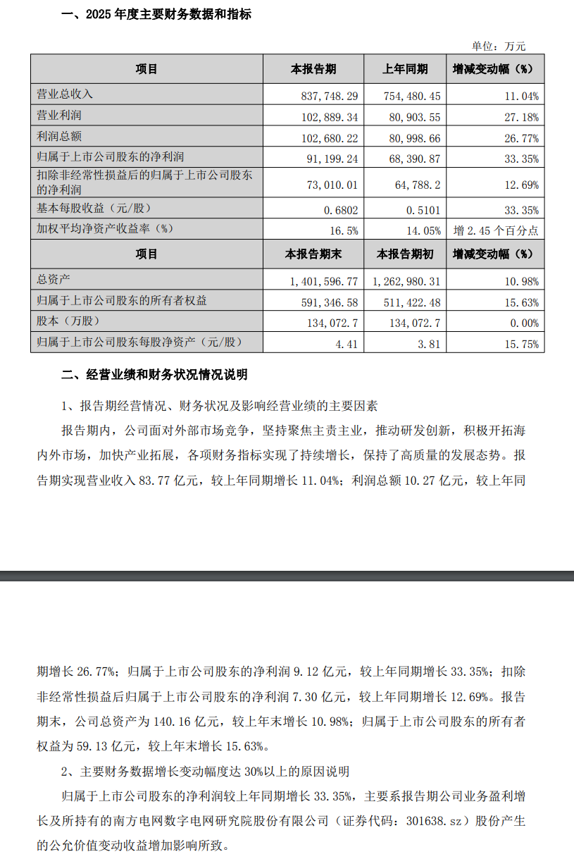 4月13日,东方电子(000682.SZ)披露2025年年度业绩快报,全年营业收入83.77亿元,上年同期75.45亿元,同比增长11.04%;利润总额10.27亿元,上年同期8.1亿元,同比增长26.77%;归属于上市公司股东的净利润9.12亿元,上年同期6.84亿元,同比增长33.35%;归属于上市公司股东的扣除非经常性损益的净利润7.3亿元,上年同期6.48亿元,同比增长12.69%;基本每股收益0.6802元/股,上年同期0.5101元/股,同比增长33.35%。