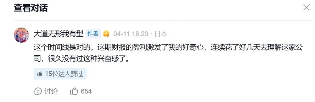 “这期财报的盈利激发了我的好奇心,连续花了好几天去理解这家公司,很久没有这种兴奋感了。”段永平表示。