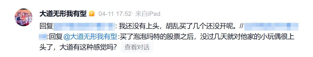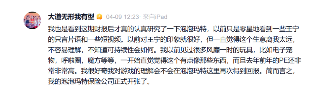 段永平表示:“我很好奇我对游戏的理解会不会在泡泡玛特这里再次得到回报。简而言之,我的泡泡玛特保险公司正式开张了。”