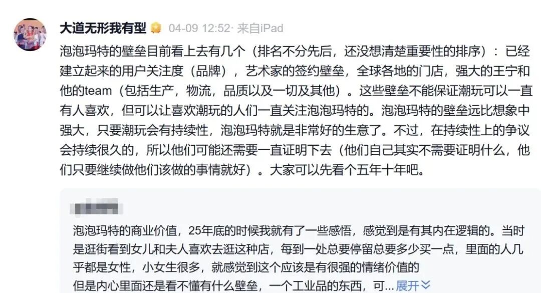 从段永平的观点看,他没有预测市场走势,而是聚焦于生意本身。他分析说,泡泡玛特的壁垒目前看上去有几个(排名不分先后,还没想清楚重要性的排序):已经建立起来的用户关注度(品牌),艺术家的签约壁垒,全球各地的门店,强大的王宁和他的team(包括生产,物流,品质以及一切及其他)。这些壁垒不能保证潮玩可以一直有人喜欢,但可以让喜欢潮玩的人们一直关注泡泡玛特。泡泡玛特的壁垒远比想象中强大,只要潮玩有持续性,泡泡玛特就是非常好的生意了。不过,在持续性上的争议会持续很久,所以他们可能还需要一直证明下去(他们自己其实不需要证明什么,他们只要继续做他们该做的事情就好)。