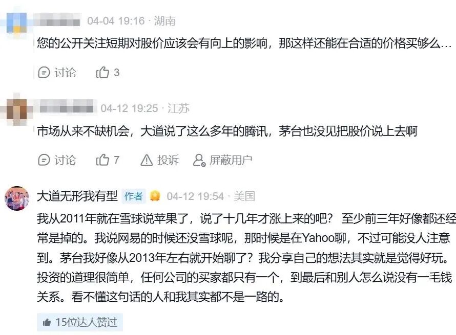段永平表示要放眼长期:“我从2011年就在雪球说苹果了,说了十几年才涨上来吧?至少前三年好像都还经常是掉的。我说网易的时候还没雪球呢,那时候是在Yahoo聊,不过可能没人注意到。茅台我好像从2013年左右就开始聊了?我分享自己的想法其实就是觉得好玩。投资的道理很简单,任何公司的买家都只有一个,到最后和别人怎么说没有一毛钱关系。看不懂这句话的人和我其实都不是一路的。”