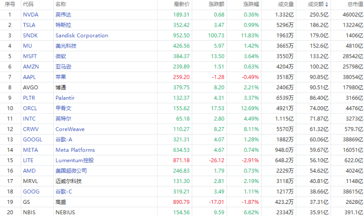 第3名闪迪收高11.83%,成交176.06亿美元。该股再创历史新高,使其今年迄今涨幅超过300%。