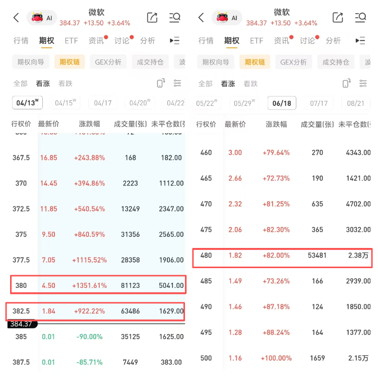 成交量第二大也是一看涨期权(MSFT_260413_C_382.5 )交易量达6.34万张,未平仓量1629张,该合约行权价为382.5美元,行权日在2026-04-13,该张期权暴涨922.22%。