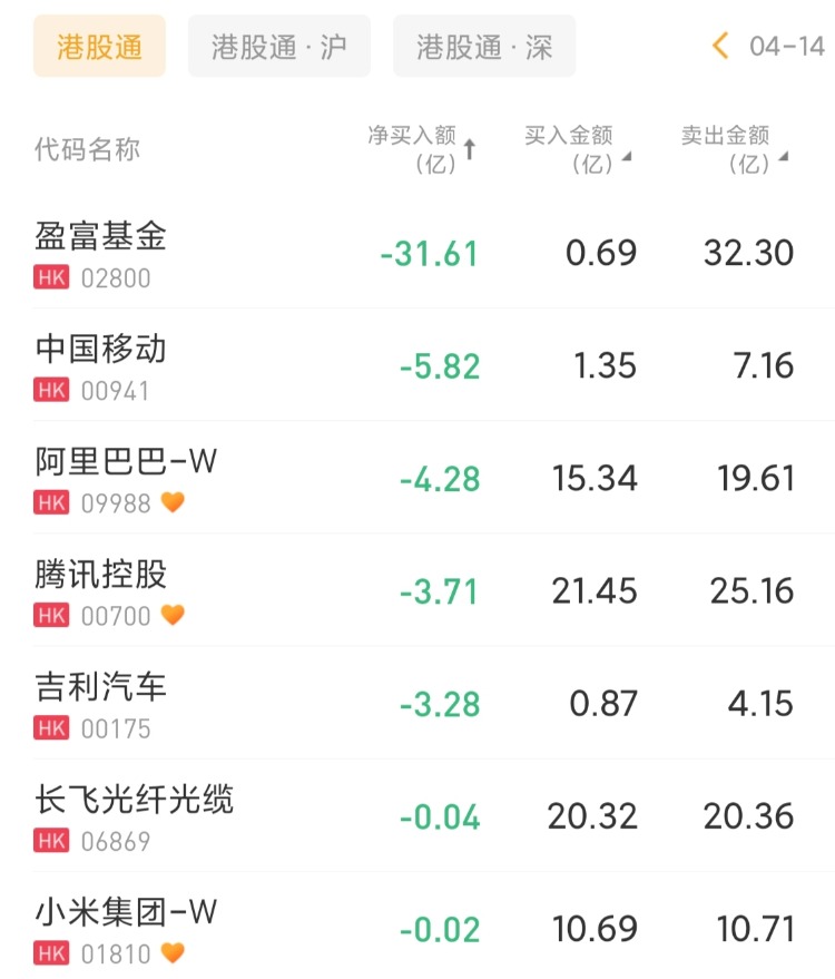盈富基金、中国移动、阿里巴巴-W分别遭净卖出31.61亿港元、5.82亿港元、4.28亿港元。