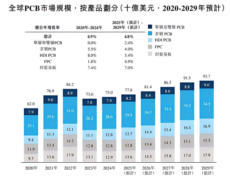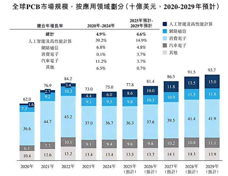 据国盛证券预测,全球PCB市场规模已从2020年的620亿美元增长至2024年的750亿美元,年复合增长率(CAGR)为4.9%。预计到2029年,全球PCB市场销售收入将达到937亿美元。其中,AI及高性能计算领域的PCB规模增长尤为迅猛,预计2029年可达150亿美元,2025至2029年间增速将高达14.9%。