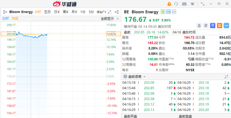 Bloom Energy $BE 盘前暴涨15%!甲骨文涨超2%;双方宣布达成燃料电池协议。